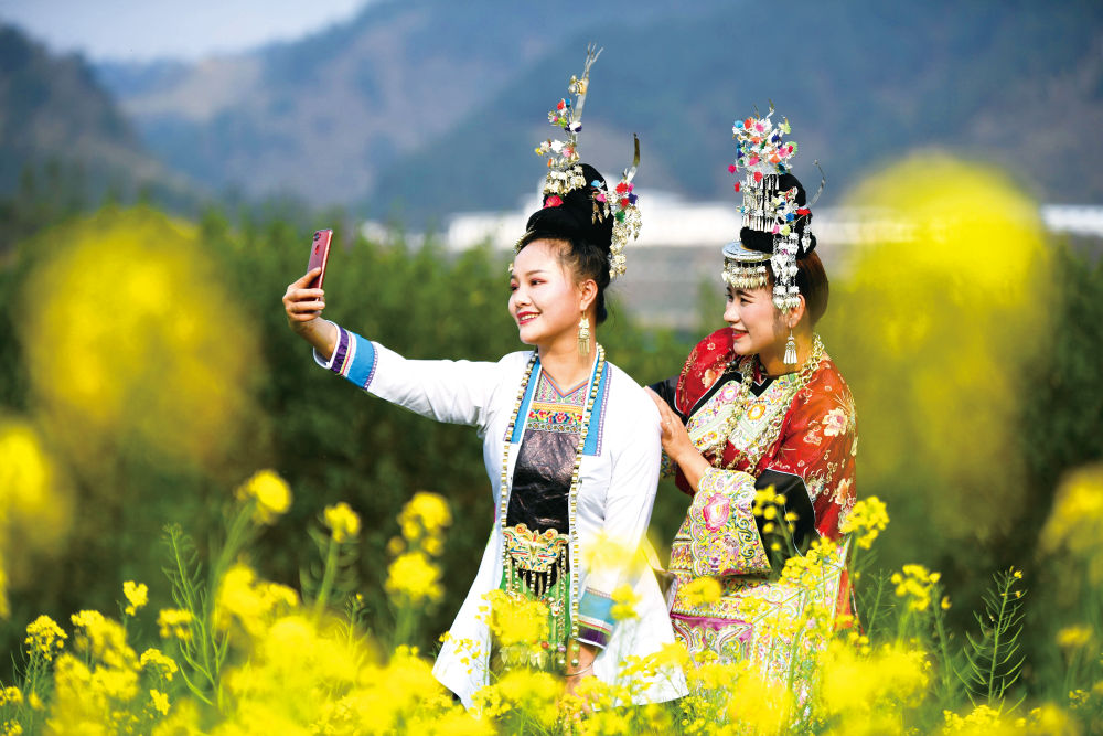 盛裝打扮的侗族姑娘在榕江縣樂(lè)鄉(xiāng)侗寨油菜花田間自拍