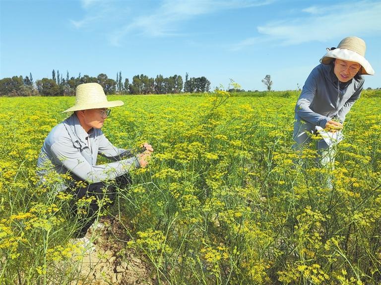 “種茴香省工省力,耗水少,市場價格相對穩(wěn)定,在每斤5元以上,效益比較可觀。今年我們種植了鐵桿茴香,通過施入生物菌肥‘保根120’,茴香表現(xiàn)出了優(yōu)異的抗重茬、防根腐等效果,預(yù)計(jì)產(chǎn)量不錯?!秉S花農(nóng)場產(chǎn)業(yè)發(fā)展部副部長張?jiān)露鸾榻B,她一邊觀察茴香長勢,一邊測定土壤墑情。