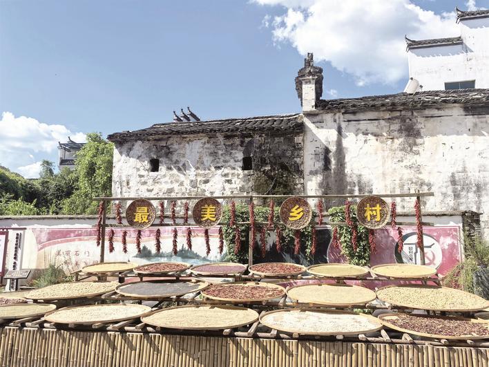 在石門(mén)村,自然風(fēng)光與文化底蘊(yùn)交相輝映。村內(nèi)廣場(chǎng)上,一排排曬盤(pán)盛滿了紅豆、玉米、辣椒等農(nóng)產(chǎn)品,展現(xiàn)了婺源人傳統(tǒng)的曬秋習(xí)俗。