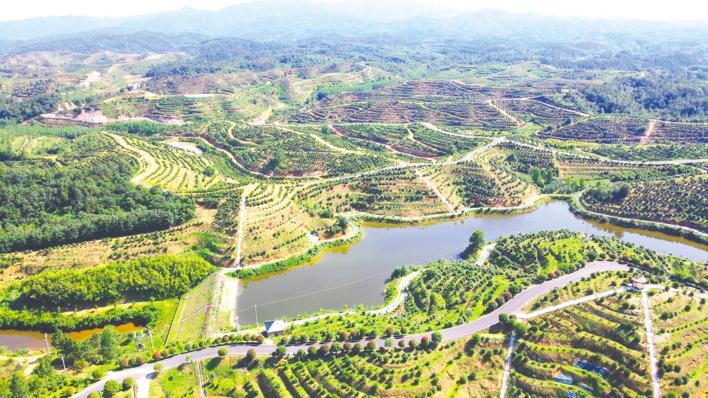 隨縣澴潭鎮(zhèn)龔家灣村的油茶產(chǎn)業(yè)示范園里,一叢叢整齊的油茶樹間,觀光道路盤山而上,直達山頂?shù)挠^光臺。