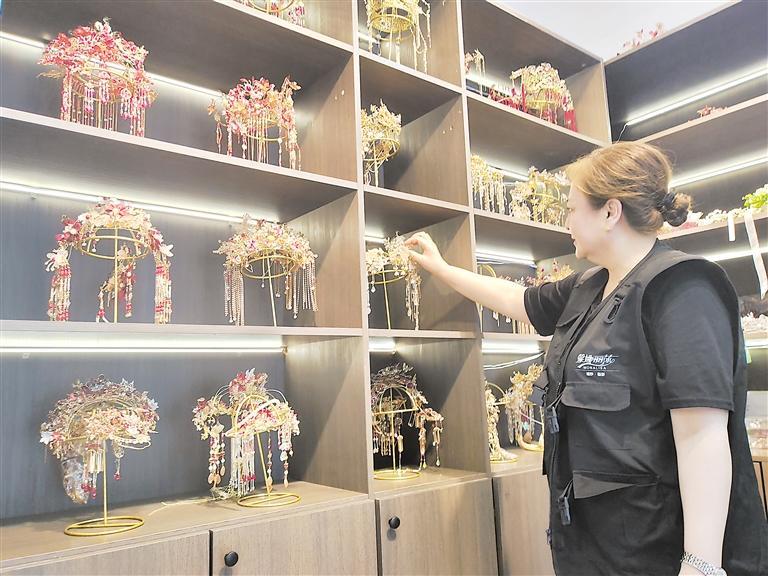 在主街福寧街上,劉莎的影樓內外裝修格外別致,櫥窗設計明亮而時尚。21年前,劉莎從新疆來到閩寧鎮(zhèn)創(chuàng)業(yè)開辦了一個百平方米的影樓,她也親眼見證了閩寧鎮(zhèn)各族移民從“吃飽穿暖”到“要生活品質”的嬗變。“過去我走村串戶給新娘化妝,能接一單五六百元錢的生意就是大單,現(xiàn)在人們生活越來越好,都來店里化妝,可以選擇做中式或西式等多種造型,接到3000多元的生意很平常?!苯┠?,消費業(yè)態(tài)不斷向新,激勵劉莎的影樓也不斷轉型升級,她不僅將影樓面積擴大至500平方米,招聘了4名固定店員,推出了數(shù)十種的攝影服務,還提供銀川周邊的旅拍?!般y川有的,我們這里也有,最近我打算外出再購置一些新的拍攝服裝,群眾消費在升級,我的服務也要升級,要跟得上群眾的需求啊!”劉莎笑呵呵地說。