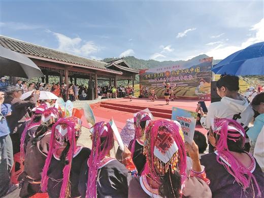 10月26日,2024年上思縣中國農(nóng)民豐收節(jié)在該縣最為偏遠(yuǎn)的村屯——南屏瑤族鄉(xiāng)常隆村百馬屯舉辦。在這里,百馬梯田金黃色的稻浪隨風(fēng)起伏,一片豐收的景象?,幾迦罕娚碇?jié)日盛裝,載歌載舞,與來自五湖四海的游客共同歡慶。