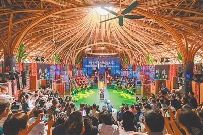 劇場(chǎng)外的廣場(chǎng)上,非遺展示展演時(shí)刻不停。當(dāng)?shù)剡x派的黎族傳統(tǒng)紡染織繡技藝、海南苗族傳統(tǒng)刺繡蠟染技藝、黎族藤編技藝、黎族竹木器樂(lè)、黎族民歌、海南苗族民歌、黎族共同舞、黎族舂米舞、海南苗族盤皇舞、海南苗族招龍舞等項(xiàng)目的傳承人持續(xù)進(jìn)行展示展演。