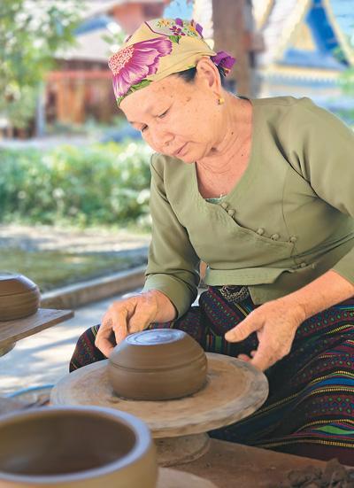 在景萊村的一處木亭里,63歲的玉相論正垂目凝神、轉動拉坯轉輪,一個普通的陶坯在她手下逐漸變身為帶有壺嘴的陶罐。玉相論43歲才開始學習傣族慢輪制陶技藝,現(xiàn)在她是西雙版納州級非遺傳承人?!鞍阎铺盏姆椒▊飨氯?,也是把傣家人的生活方式傳下去?!庇裣嗾撜f。