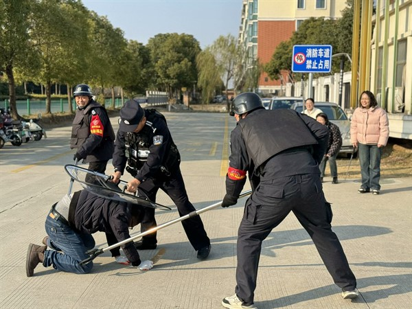 演練期間,一名佯裝以探視幼兒為借口的“歹徒”,手持器械妄圖強行闖入校園。面對這一“不速之客”,校園保安迅速反應(yīng),當即對歹徒予以勸阻,并即刻啟動一鍵報警系統(tǒng)向公安機關(guān)報警,同時向園內(nèi)應(yīng)急指揮部匯報情況。相關(guān)責任教師在警報拉響后,迅速且有條不紊地將正在戶外開展活動的幼兒疏散至安全地帶。應(yīng)急小組、校園保安與在場民警緊密協(xié)作,運用防暴盾牌筑起堅固防線進行格擋防御,借助鋼叉巧妙干擾歹徒的行動。憑借彼此間的高度默契配合,逐步縮小對歹徒的包圍圈。在全體現(xiàn)場人員的齊心協(xié)力之下,最終成功將歹徒制服。整個演練流程各個環(huán)節(jié)緊密銜接、有條不紊,順利達成預(yù)期目標。