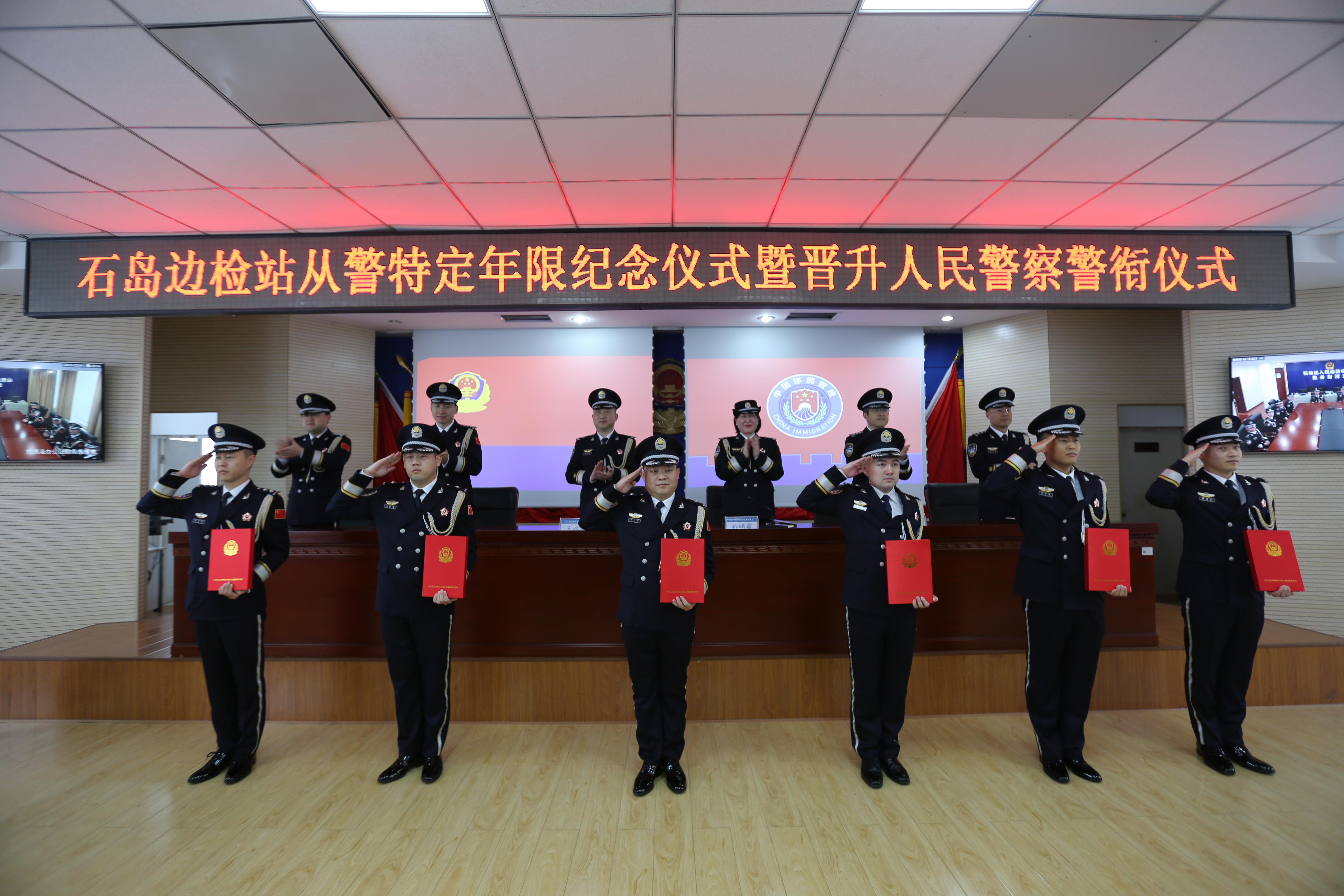 隨后,站黨委書記、站長王永春同志代表站黨委向從警特定年限和晉升警銜民警職工表示祝賀,他指出,授予晉升警銜是組織的激勵(lì),也是黨和人民更大的信任,希望晉銜人員要心無旁騖干好主責(zé)主業(yè),時(shí)刻把使命放在心上、把責(zé)任扛在肩上,與最優(yōu)對(duì)標(biāo)、與強(qiáng)者比拼、與快者賽跑,主動(dòng)迎接挑戰(zhàn)、經(jīng)歷考驗(yàn)、接受檢驗(yàn),以嶄新面貌和優(yōu)異業(yè)績?yōu)樽约旱膹木脑鎏硇碌墓獠?。最后,全體民警重溫了公安機(jī)關(guān)人民警察誓詞,并拍照留念。(石島出入境邊防檢查站 畢凱珺 崔浩 常亮)