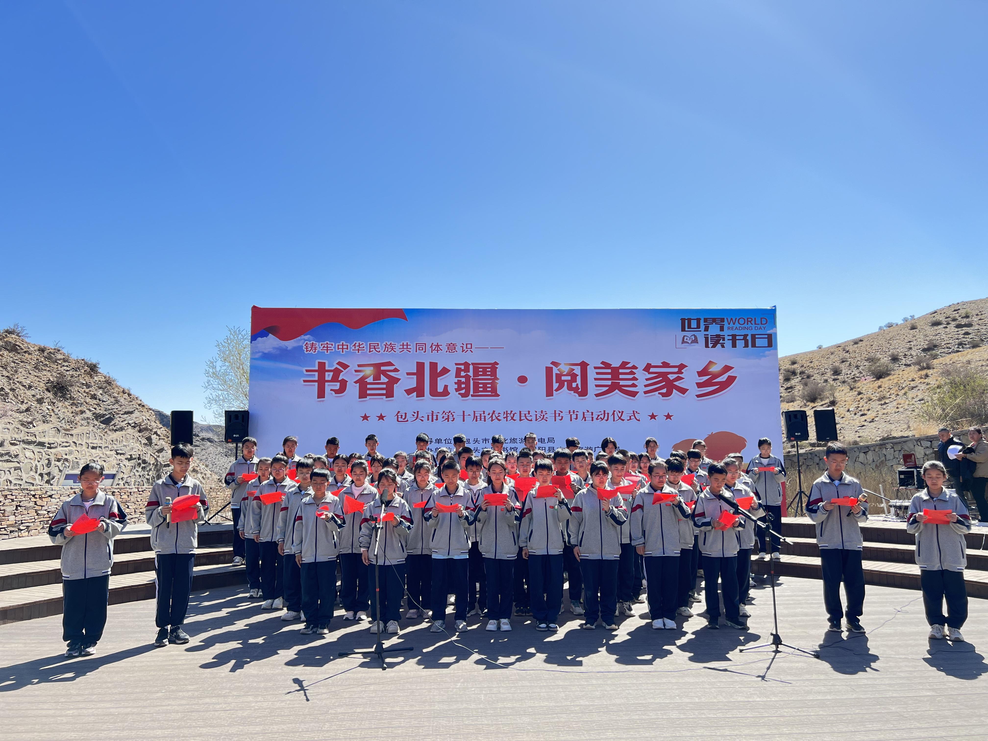 第十屆農(nóng)牧民讀書(shū)節(jié)上,固陽(yáng)縣第三中學(xué)的學(xué)生開(kāi)展集體誦讀活動(dòng)(包頭市圖書(shū)館供圖)