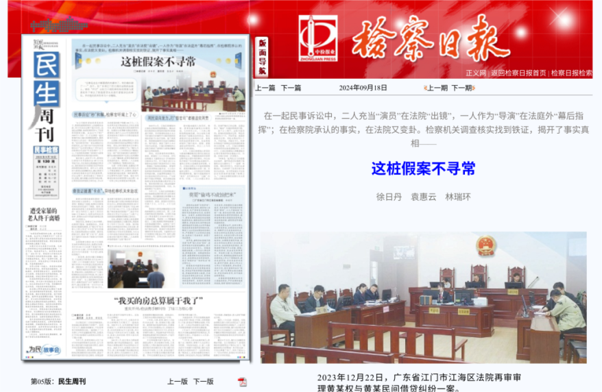 《檢察日報》民生周刊首版刊登報道“黃某某與黃某民間借貸糾紛虛假訴訟案”