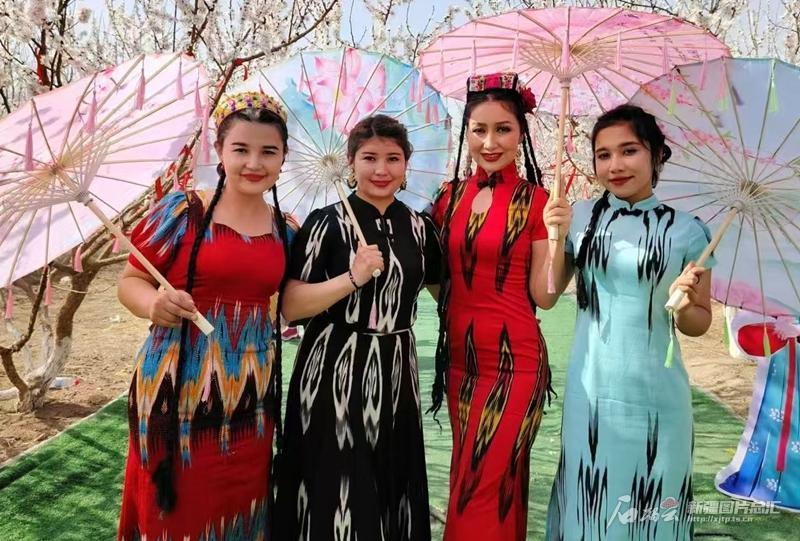 在托克遜縣夏鎮(zhèn)南湖村,游客穿著鮮艷的服裝,在杏樹下合影留念。尚明 攝