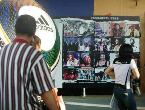 南非館入口處,藝人才藝展示廣告。馬霞 攝