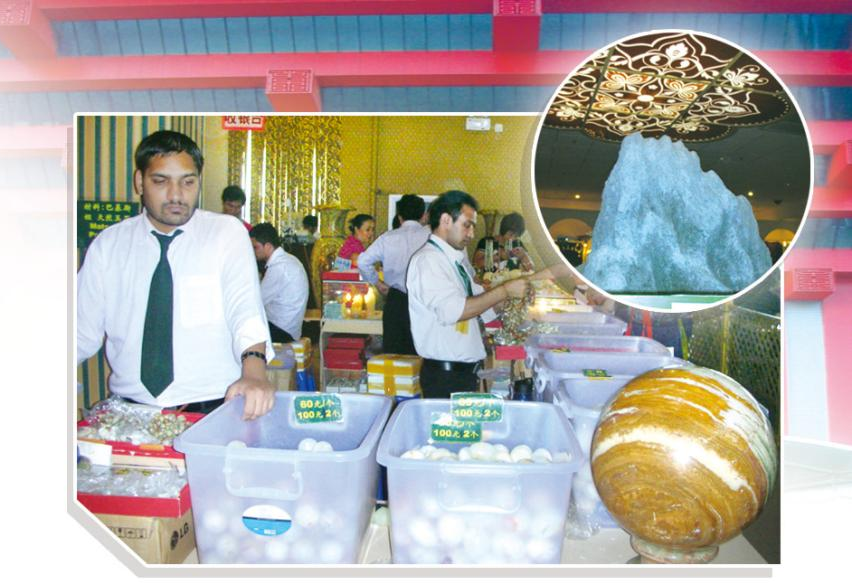 在2010上海世博會(huì)巴基斯坦館內(nèi),可見形態(tài)各異的玉石作品。右上為“假山”。馬霞 攝