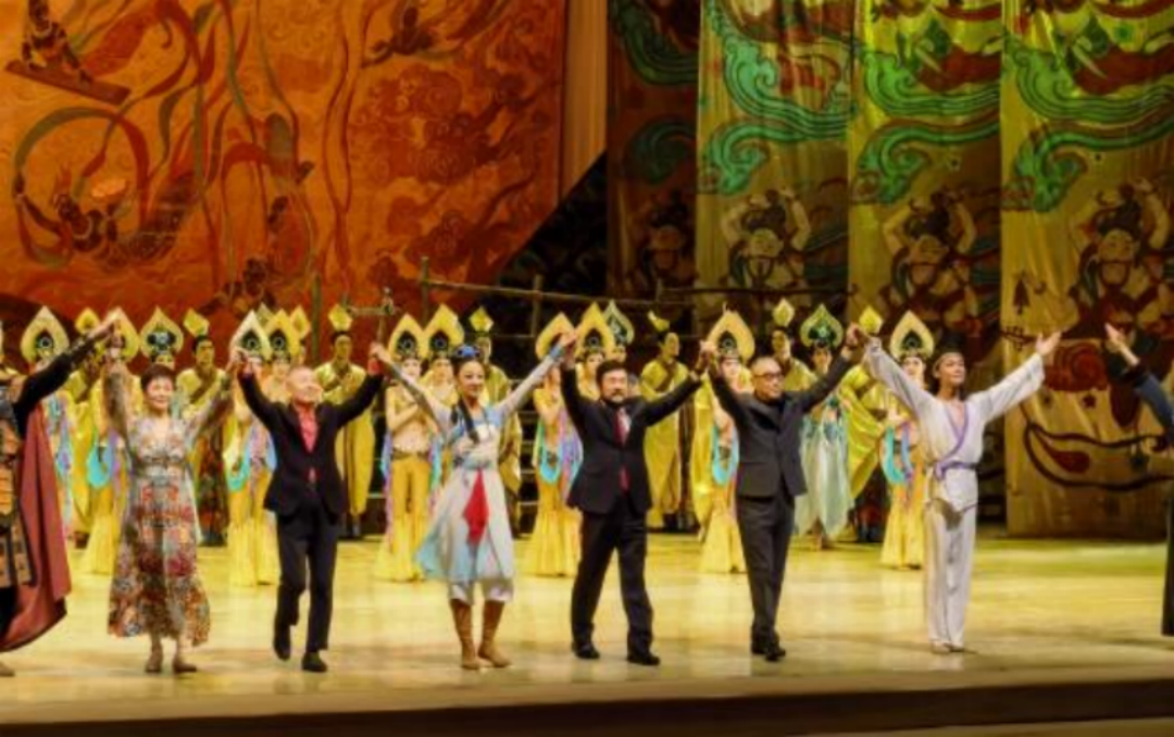 《大夢(mèng)敦煌》由蘭州歌舞劇院創(chuàng)排,于2000年在京首演,可謂占盡天時(shí)地利人和。當(dāng)其時(shí),上有2019年中央領(lǐng)導(dǎo)視察莫高窟,有力推動(dòng)敦煌文化研究服務(wù)共建“一帶一路”決策;前有甘肅省歌舞劇院于1979年創(chuàng)作的“中國(guó)舞劇的里程碑”——舞劇《絲路花語(yǔ)》作標(biāo)桿;后有地方政府大力支持,集一流的制作班底于一身,想不出彩兒都難。