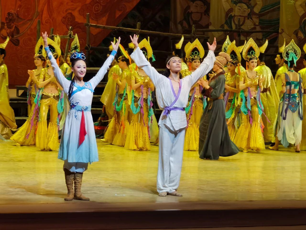舞劇《大夢(mèng)敦煌》謝幕時(shí)分。劇中李祎然(左)、高萬(wàn)鑫的雙人舞,至情至誠(chéng)充滿張力,令人動(dòng)容。馬霞 攝