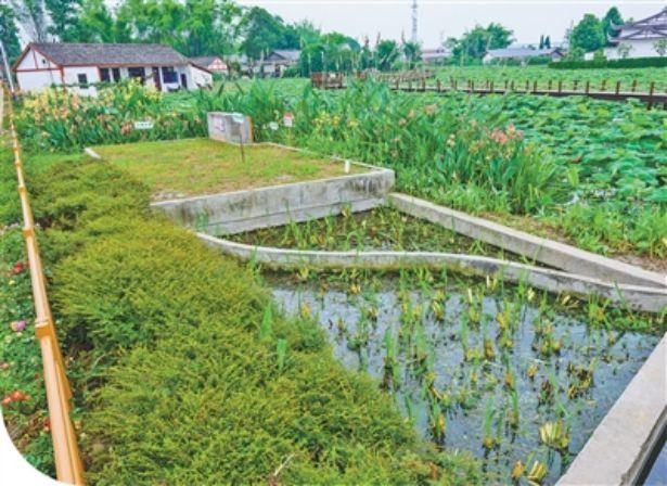 荷塘邊,水聲汩汩。草地下,是由3座池子組成的微動(dòng)力污水處理池?!斑@里包括沉渣池、四級(jí)厭氧池和濕地池?!蓖趺粽f(shuō),農(nóng)戶家中排出的污水經(jīng)過(guò)沉淀和厭氧處理,再經(jīng)過(guò)濕地池火山石凈化,達(dá)標(biāo)后排入荷塘。