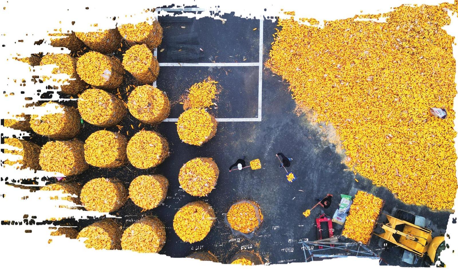 梨樹(shù)縣盧偉農(nóng)機(jī)農(nóng)民專(zhuān)業(yè)合作社社員在晾曬玉米。趙晶 航拍