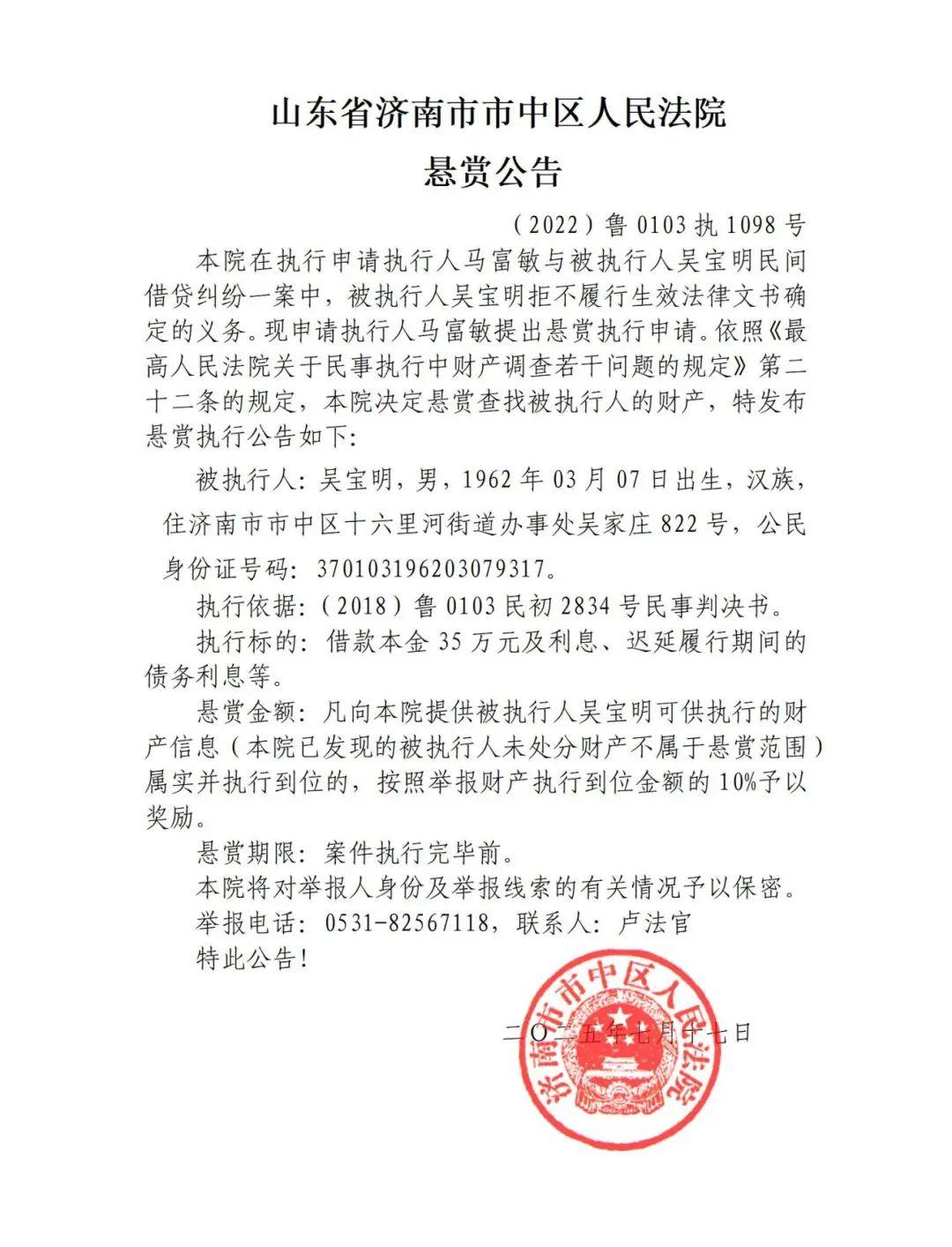 本院在執(zhí)行申請(qǐng)執(zhí)行人馬富敏與被執(zhí)行人吳寶明民間借貸糾紛一案中,被執(zhí)行人吳寶明拒不履行生效法律文書確定的義務(wù)?,F(xiàn)申請(qǐng)執(zhí)行人馬富敏提出懸賞執(zhí)行申請(qǐng)。依照《最高人民法院關(guān)于民事執(zhí)行中財(cái)產(chǎn)調(diào)查若干問題的規(guī)定》第二十二條的規(guī)定,本院決定懸賞查找被執(zhí)行人的財(cái)產(chǎn),特發(fā)布懸賞執(zhí)行公告如下: