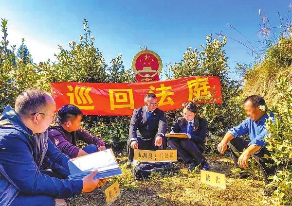 圖為重慶市酉陽土家族苗族自治縣人民法院酉酬人民法庭庭長陳長周在油茶林里現場開庭審理合同糾紛。資料圖片