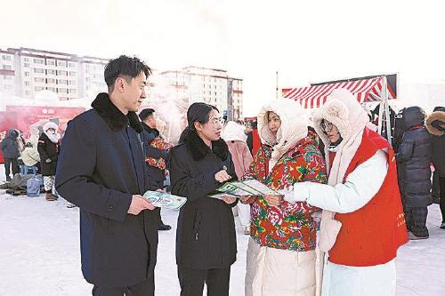 內(nèi)蒙古自治區(qū)扎蘭屯市檢察院檢察官在集市向群眾普法。