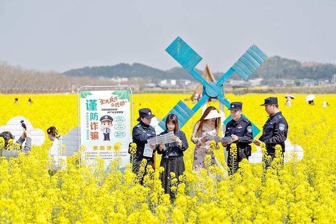 “賞花拍照,請看管好手機錢包!”“所有刷單都是詐騙,陌生鏈接千萬別點!”花海步道上、游客休憩點旁,民警輔警手持宣傳冊,穿梭在人群中。涪城區(qū)分局楊家派出所副所長魯?shù)铝终龓ш犜诤诵膮^(qū)域值守,他一邊協(xié)調(diào)現(xiàn)場秩序,一邊向往來的游客講解最新騙局。響亮的提醒聲和著花香,飄進游客心里。