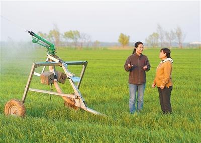 陳世君(左)為村民講解小麥科學(xué)灌溉的知識(shí)。陳雷 攝