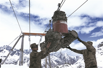 連隊(duì)通過(guò)索道將補(bǔ)給物資運(yùn)送到哨所。