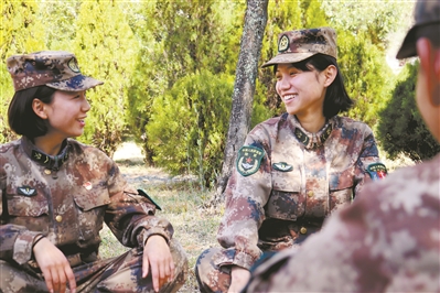圖為訓(xùn)練間隙,文曉曼(左二)與戰(zhàn)友談心。