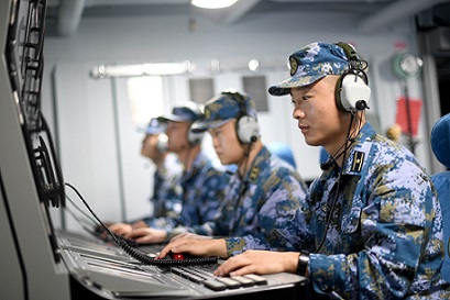 5月2日,中國(guó)海軍第35批護(hù)航編隊(duì)官兵在操控臺(tái)上發(fā)出指令。江山 攝