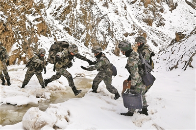 5月上旬,新疆克孜勒蘇軍分區(qū)邁丹邊防連官兵前往海拔4000多米的某點(diǎn)位開展例行武裝巡邏,加大對高海拔防區(qū)的執(zhí)勤管控力度,確保邊境安全穩(wěn)定。圖為官兵協(xié)助越冰河。