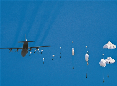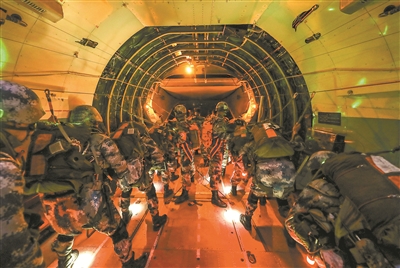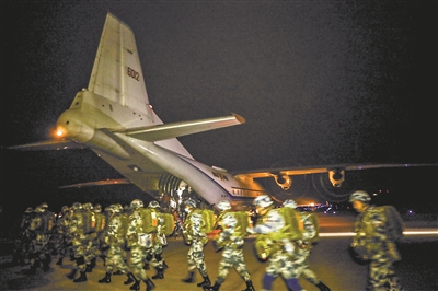 凌晨4時,數(shù)架滿載全副武裝傘兵的大型運(yùn)輸機(jī),依次騰空而起向預(yù)定空域機(jī)動。