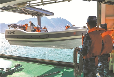 吊放小艇開展救援演練。