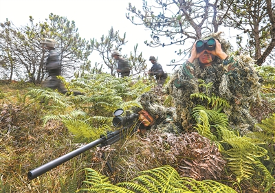 圖③:戰(zhàn)術(shù)演練中,擔(dān)當(dāng)狙擊手的新戰(zhàn)士占領(lǐng)有利地形,掩護(hù)突擊組行動(dòng)。