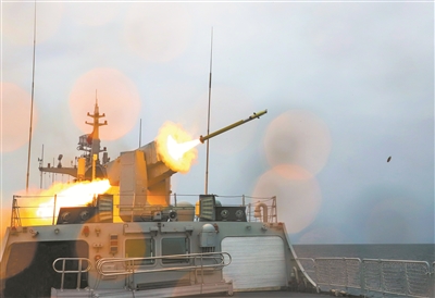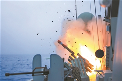 “開火!”指揮員下達(dá)作戰(zhàn)命令。黃石艦上,防空導(dǎo)彈拖著紅色尾焰呼嘯而出,直撲“敵”機(jī)。信陽(yáng)艦上,主炮噴吐烈焰,對(duì)“敵”艦實(shí)施有效火力打擊……