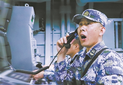 圖②:信陽(yáng)艦主炮指揮員下達(dá)戰(zhàn)斗指令。
