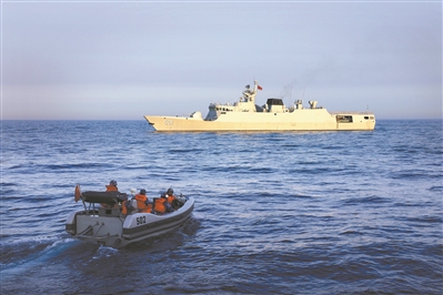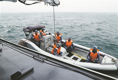 圖④:信陽(yáng)艦吊放小艇展開訓(xùn)練。