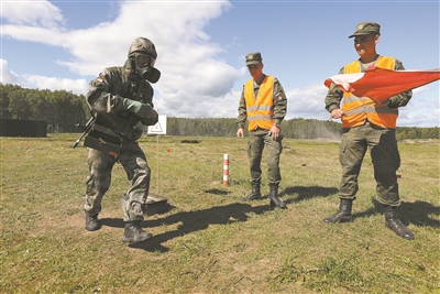 “安全環(huán)境”項(xiàng)目比賽前,我軍參賽隊(duì)員(左)進(jìn)行單組賽適應(yīng)性訓(xùn)練。傅道永攝