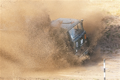 8月27日,在“汽車能手”項(xiàng)目接力賽中,我軍參賽隊(duì)員駕車通過泥坑路段。王世民攝