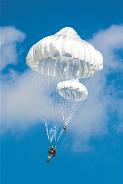 飛抵預定空域,在抗“藍軍”反空降火力掩護下,裝備物資首先投放,全副武裝的學員緊隨其后實施集群傘降,朵朵傘花在天空競相綻放。