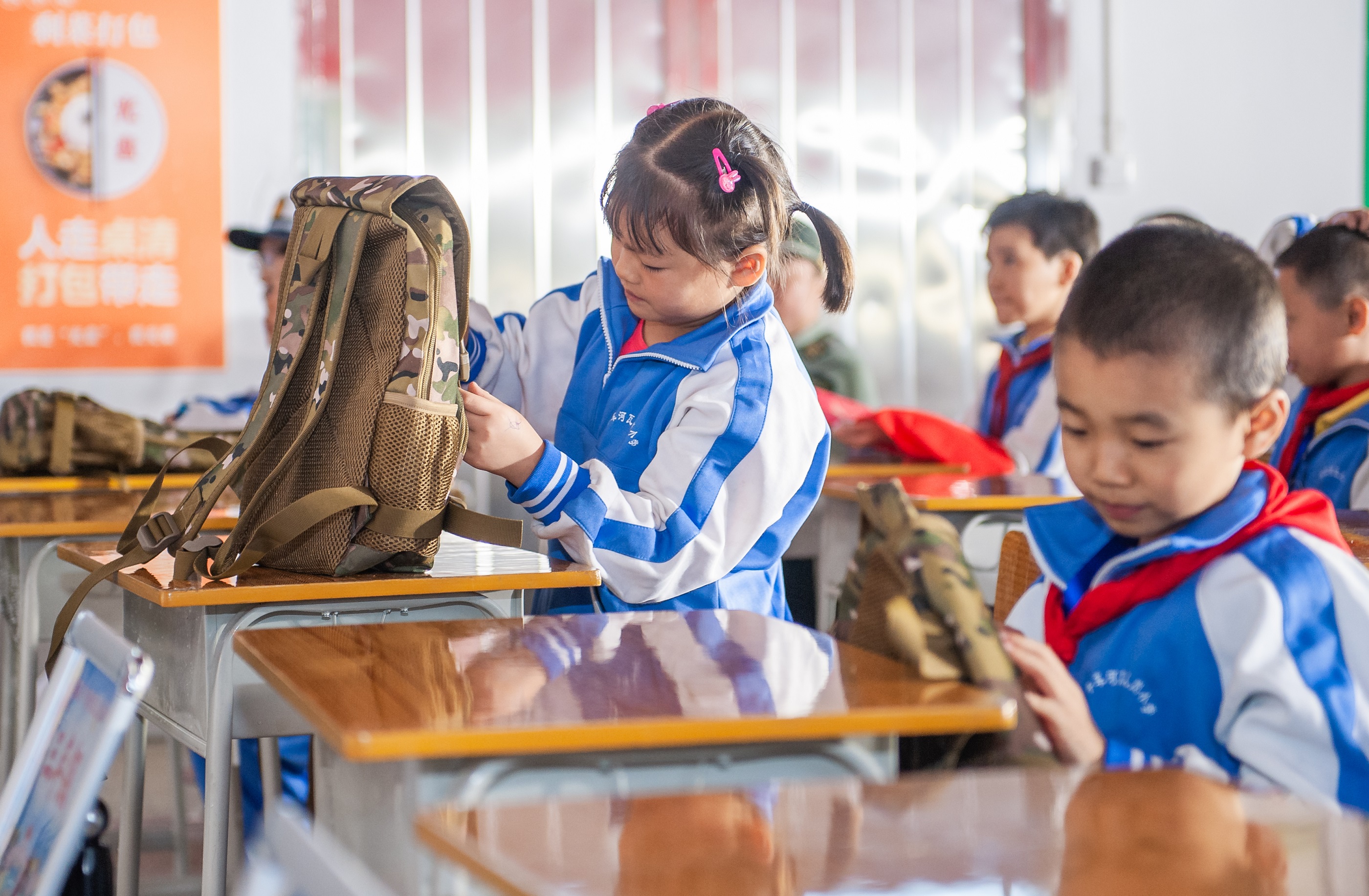 圖為瓦兒崗小學(xué)學(xué)生開(kāi)心地打開(kāi)迷彩小書包。彭三珊 攝