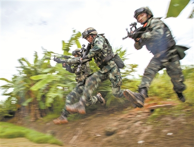密林深處,一伙“暴恐分子”挾持人質(zhì)正在逃竄。特戰(zhàn)隊(duì)員兵分兩路,夾擊追剿。一陣槍聲過后,“暴恐分子”被悉數(shù)擊斃,人質(zhì)成功獲救。這是武警云南總隊(duì)某支隊(duì)機(jī)動(dòng)一中隊(duì)實(shí)戰(zhàn)化練兵的一幕景象。