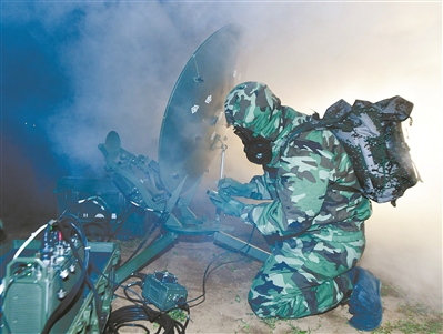 “前方有情況,全身防護(hù)快速通過(guò)!”接到命令,參訓(xùn)人員迅速掏出隨身攜帶的防毒面具和防護(hù)服,在規(guī)定時(shí)間內(nèi)完成防護(hù),并準(zhǔn)確判定風(fēng)向,以特定隊(duì)形快速通過(guò)。