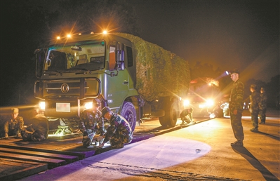 測(cè)量邊距、打入鐵釘、捆綁加固……鐵路裝載現(xiàn)場(chǎng),官兵僅憑汽車(chē)近光燈和手電照明,熟練地進(jìn)行分組作業(yè)。除了器械碰撞聲,很少聽(tīng)到其他聲音,全程一氣呵成、干凈利落。
