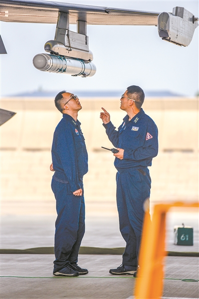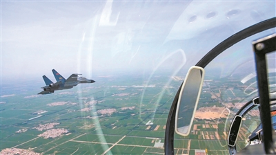 翻轉(zhuǎn)、規(guī)避、俯沖……殷凡明接連使出高難度動作,與“敵”機(jī)纏斗,為僚機(jī)實(shí)施進(jìn)攻創(chuàng)造條件。張瑋則機(jī)動迂回,伺機(jī)從側(cè)翼發(fā)起攻擊。
