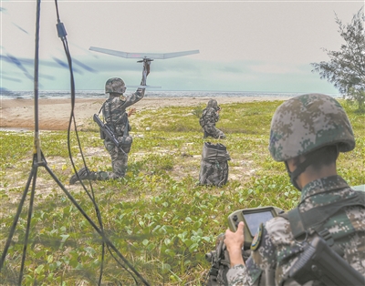 地面,敵后偵察組兵分多路,通過武裝泅渡、駕舟登陸等方式向目標(biāo)地域隱蔽滲透。同時(shí),破襲組根據(jù)無人機(jī)偵察獲取的信息,迅速占領(lǐng)有利陣位,對“敵”目標(biāo)進(jìn)行精準(zhǔn)打擊。