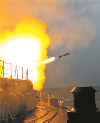 寒風(fēng)凜冽,波濤翻滾。編隊(duì)剛剛抵達(dá)訓(xùn)練海域,戰(zhàn)斗警報(bào)拉響,太原艦率先接到主炮對(duì)海射擊的命令。指揮員下達(dá)指令,火控部位密切協(xié)同,果斷擊發(fā)?;鹆Υ驌暨^(guò)后,又傳來(lái)“敵”導(dǎo)彈來(lái)襲通報(bào)。在編隊(duì)指揮所統(tǒng)一指揮下,各艦協(xié)同配合,釋放干擾彈,成功規(guī)避來(lái)襲導(dǎo)彈。