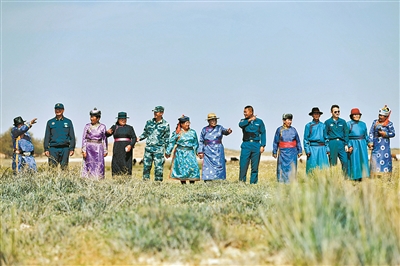 圖②:官兵和草原牧民感受飛播帶來的生態(tài)變化。