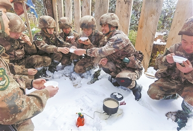 又走了4個(gè)小時(shí),夜色中到達(dá)宿營(yíng)地。大家撿來一些干枯的樹枝,生火做飯。晚來天寒,官兵們頭頂塑料布擋住雨雪,身下墊著樹葉展開睡袋和衣而臥。戰(zhàn)士們睡在靠近火堆的地方,侯云則把鋪蓋搬到了最邊上。