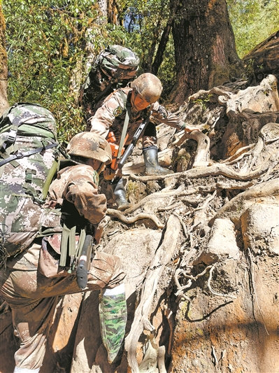 原始森林里,大樹盤根錯(cuò)節(jié),幾乎沒有路。為防止雪水濕鞋,官兵們不得不穿上雨靴,再用膠帶纏住褲腳??梢韵胍姡┲@樣的行頭,走在這樣的路上,該是何種滋味。