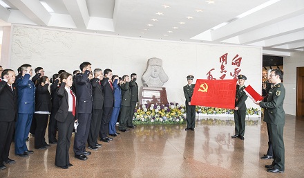 在雷鋒紀(jì)念館前,沈陽軍事法院院長(zhǎng)陶韜、遼寧省高級(jí)人民法院副院長(zhǎng)任延忠等50余名軍地法官面向黨旗莊嚴(yán)宣誓,重溫入黨誓詞。