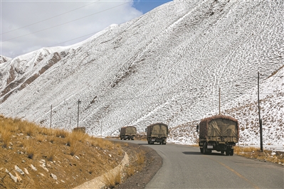 急行110公里,車隊來到庫地達坂。車窗外,一邊是千仞絕壁,一邊是陡崖深谷。“庫地達坂是新藏線上的第一個冰雪達坂,地勢險要……”駕駛員話音未落,一塊石頭便從山上掉落到車旁,所幸有驚無險。