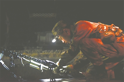 官兵夜間卸載裝備。